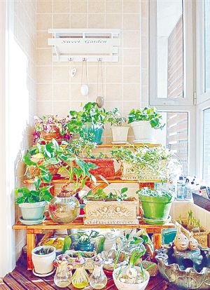 阳台一角是主人的小花园,三层的原木架子错落有致,虽然是冬天,各种绿植和花花草草们却也是生机盎然的。
