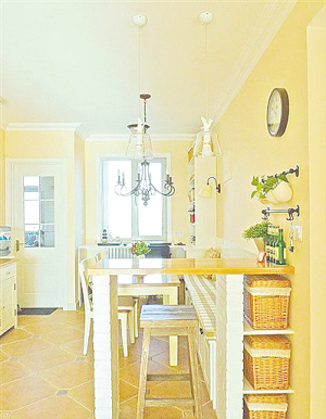 张小坏家所有房间都是柔和的暖色调,淡黄色的墙壁、淡绿色的家具、暖褐色的地板砖,还有原木色的家具表面,都洋溢着一股浓浓的美式田园风。