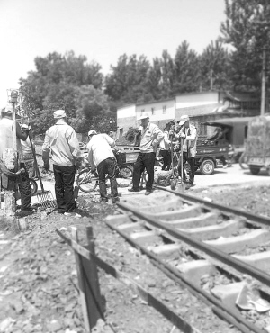 5月12日,为尽早实现五一路铁道口拓宽通车,十多名施工人员忙着对道口混凝土路面进行破碎施工。据现场一名施工人员介绍,该铁道口人流量和车流量比较大,由于这里路面较窄,严重影响市民正常通行。整修后,这里的路面将由原来的6米拓宽到22米,如果工程进展顺利,该铁道口有望于本月底实现拓宽通车。晚报记者 张志新 摄