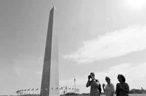 5月12日,在美国首都华盛顿,游客在华盛顿纪念碑前拍照。