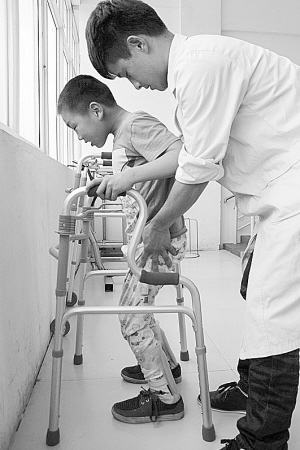 近水楼台先得月。昨日,在周口市康复教育技能培训中心,已有残疾儿童使用新的助行器进行康复训练(如图)。