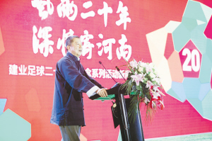 新闻发布会上,建业集团副总裁刘大勇发布了建业足球20周年纪念系列活动的主要内容。他说,本次纪念活动共分为欢聚、回顾、致谢三大部分。包括新闻发布会、建业足球20周年纪念演唱会、建业足球20周年系列“深爱——与建业足球有关的故事”素材征集活动、建业足球20周年新书发布、足球宝宝及宝贝评选、中国建业足球发展论坛等系列活动都将一一呈现。这些都让在场嘉宾激动不已,对系列活动的举行也充满了期待。