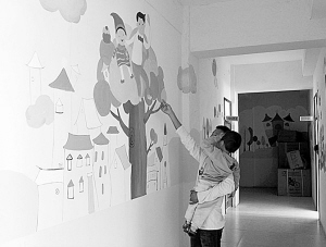 相关负责人介绍,在这里进行康复训练的孩子大都是脑瘫患儿和智障患儿,平时他们的康复训练很辛苦。“在墙壁上绘出多彩世界,让色彩对他们的大脑形成一定的刺激,让他们觉得自己是在童话世界、快乐空间里生活学习,对他们的康复训练能带来积极的影响”。图为家长看着图案给孩子讲故事。晚报记者 郭坤 摄