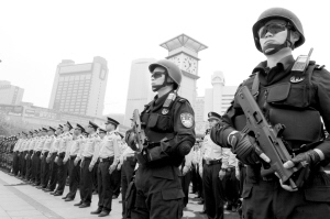 5月14日,特警、巡警、铁路公安等多警种荷枪列队参加启动仪式。