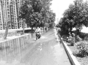 5月15日上午,市民刘女士拨打本报新闻热线称,东新区腾飞路与泰山路交叉口以北的非机动车道上存有大量积水,足有200米长,积水最深处达30多厘米,严重影响市民通行。当日,东新区市政管理办公室负责人张鹏接受记者采访时称:“我们已派人进行了调查,路面积水来自附近建筑工地,这家工地排出的水有杂质,堵塞了下水道,水从某个窨井口流出,在路面大量积存。我们将对整个积水路段的下水道进行排查,以便及时疏通。”晚报记者 张志新 摄