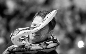 5月17日,在伦敦宠物秀上,一条蟒蛇和自己的主人嬉戏。