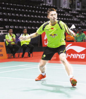 中国队选手林丹在比赛中回球,他以2∶0战胜法国选手克莱伯特。