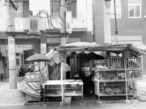 5月19日,记者在周口市区六一南路看到,一家活禽店将摊位摆在路边的电线杆旁,摊位上方不到一米处就安装了一台变压器。附近居民担心,活禽店离变压器这么近,是否会有安全隐患。