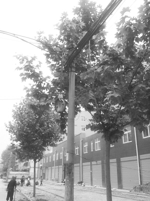 5月19日,记者在周口市区六一南路看到,一盏破损的路灯挂在高压线上摇摇欲坠,随时会给过往行人带来安全隐患,附近居民呼吁有关部门尽快整修一下。晚报记者 张燕 摄