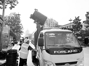 此外,市长刘继标和市政府主要领导带领市城管委、市文明办、4个区和15个乡(办)负责人等,实地参观了川汇区小桥办事处建东社区,看到社区卫生已做到全覆盖,村中处处干净整洁,没有一处垃圾死角,领导和村民纷纷交口称赞。另外,在七一路沿线,川汇区投资设置了100个绿色圆形垃圾桶,这些垃圾桶内的垃圾满了以后,环卫工人只要把垃圾桶的挂钩挂在小型垃圾收集车上,垃圾收集车就会自动将垃圾桶升起、翻转,把垃圾尽数倒入密闭车斗内(如图),省去了人工操作的时间和力气。