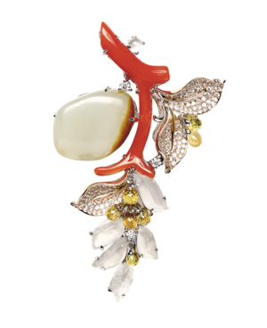 因为长期以古玩的面貌出现,这些材质除了给人珍贵的印象以外,还拥有浓郁东方意象与深厚的历史文化印迹;他们在珠宝设计中的应用也有不同的侧重方向:一种是高级珠宝,将大小合适的古玩雕件直接进行设计组合与镶嵌,既能赋予珠宝独特的文化内涵,同时经过雕刻加工的材质可以展现高级珠宝的独特性与唯一性。当然造价也都不低,有一定门槛。还有一种商业化大众珠宝,是将材质原石打磨成简单的抽象几何体进行量产化的设计加工,简洁的设计能给材质带来年轻而时尚的气息,这类珠宝在价格上比较接地气,能真正将这些材质及文化普及到日常的生活中。