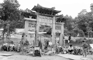 5月20日,工人在湖北省恩施州咸丰县唐崖土司城遗址上对石牌坊进行保护。