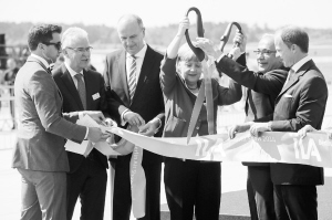 5月20日,在德国柏林,德国总理默克尔(右三)为柏林国际航空航天展开幕式剪彩。