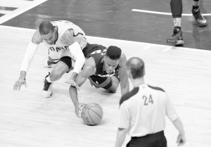 当地时间5月20日,热火队球员科尔(中)与步行者队球员沃特森(左)争抢。当日,在NBA季后赛东区决赛第二场角逐中,迈阿密热火队客场以87∶83战胜印第安纳步行者队,将两队总比分扳为1∶1平。