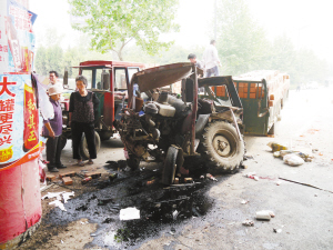 当天上午,记者在现场看到,出事拖拉机仍在现场,拖拉机车头已被撞得面目全非(如图),包裹在桥柱上的广告纸也被撞成了碎片,地上散落着大量机油和一些血迹。几名工人正在将事故车辆上的红砖往停在附近的另一辆拖拉机上搬运。