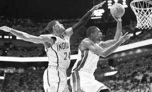 当地时间5月24日,热火队球员波什(右)在比赛中突破上篮。当日,在2013-2014赛季NBA季后赛东部决赛第三场比赛中,迈阿密热火队主场以99∶87战胜印第安纳步行者队,总比分暂时以2∶1领先。新华社发