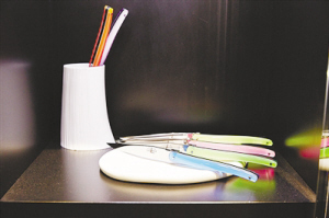 不同于普通的厨房用品做装饰,把长短尺寸不一的黑色刀具置于五彩背景上,绝对是一件超酷的艺术品。