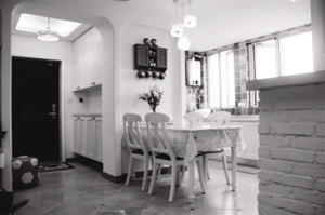 从收纳性超强的玄关进入,左手边就是开放式厨房和小餐厅。原本封闭性的厨房和相邻的房间打通,厨房变长,将相邻房间的窗户纳入厨房,采光效果更好,白色橱柜搭配彩色复古砖,清爽简约而不单调。