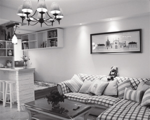 淡黄色调的客厅空间,给人暖暖的视觉效果。米色沙发上搭配白色和棕色的格子沙发垫,浅色和条纹的靠包淡雅舒适。电视背景墙做成浅浅的凹槽,搭配淡蓝色的搁板和电视柜,少了地中海的耀眼和明媚,却让人能感觉海面上吹来的清幽的海风。两个卧室则以花朵为主要图案,充满了甜美的田园风情。