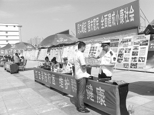 5月26日上午,我市组织各县市卫生监督部门在市区五一广场,利用横幅、宣传板块、宣传页等形式,向市民介绍如何辨别“黑诊所”、“假医生”等。晚报记者 张志新 摄
