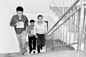 当日,山东省栖霞市一家公司举行首届爬楼梯比赛,40余名男女员工利用工间操时间,分批次参加了共16层楼的爬楼梯比赛,倡导健康节能的生活方式,体验日常运动的快乐。新华社发