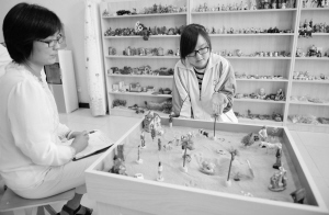 5月27日,在固安县第一中学艺术中心,一名高三学生在心理老师(左)陪伴下进行沙盘游戏。
