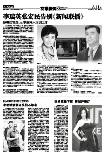 本报综合消息 5月28日凌晨3点,有网友在微博发布了一张与央视新闻联播主播张宏民叙旧的照片,并称“突然听说他和李瑞英一道要退出新闻联播,心里一阵失落。”获悉此消息后,记者以短信的形式第一时间联系上李瑞英本人,而李瑞英在凌晨4时许也以短信的形式向记者证实,将与张宏民退居幕后,一道告别《新闻联播》。