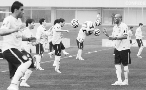 当地时间5月28日,巴西队球员在训练中。当日,巴西国家队在里约热内卢州特雷索波利斯进行首次公开训练,备战下月开幕的2014年世界杯决赛阶段的比赛。