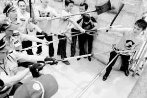 5月29日,合肥市四十六中学的校园安保人员正在模拟处置两名“暴力歹徒”。