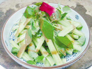 青瓤黄瓜300g、荆芥50g、盐5g、味精水10g、白醋15g、陈醋15g、蒜泥20g、香油20g、芝麻酱10g。