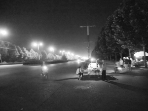 随着夜幕降临,周口师范学院与罗庄之间的这条文昌大道开始变得“繁华”起来,马路北侧人行道上的学生越来越多,来来往往穿梭在罗庄与学校之间。快车道上,偶尔还可以看到非机动车或行人的身影,一辆辆疾驰的汽车从他们身边呼啸而过。马路南侧的人行道和快车道上的路灯亮了,但马路北侧的路灯一直没有亮起来。一条马路,南侧与北侧一明一暗,对比鲜明(如图)。令人奇怪的是,亮着灯的马路南侧行人稀少,而人流如织的马路北侧路灯却不亮,路边的小贩自带的电灯发着微弱的光。