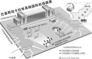 卡拉奇机场袭击事件发生在当地时间8日23时20分左右,10名武装分子身着机场安全部队制服潜入机场,随后向安全人员投掷手榴弹并开火。巴基斯坦军方发言人9日说,经过军方、机场安全部队和警方5小时的联合行动,10名武装分子已被全部击毙。