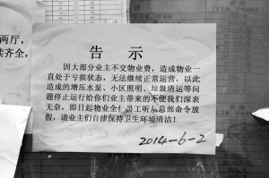 在小区门口有物业公司张贴的告示。告示的内容为:因大部分业主不交物业费,造成物业一直处于亏损状态,无法继续正常运营,因此造成增压水泵、小区照明、垃圾清运等停止运行,给业主带来不便,我们深感无奈。即日起,物业公司全体员工听从总部安排放假,请业主自律保持卫生环境清洁。