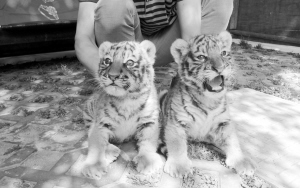 当日,湖北省十堰市人民公园动物园内的两只东北虎幼崽正式与广大游客见面。5月2日,两只东北虎成年虎在十堰市人民公园动物园产下一雄一雌两只幼崽,目前,已过满月的两只小东北虎体重均已接近10斤,生长状况良好。新华社发