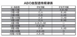1925年左右,德国学者伯恩斯坦揭示了ABO血型遗传的规律。她认为,在决定ABO血型遗传的基因座位上,存在A、B、O三个等位基因,三个等位基因中,A和B基因对O基因为显性基因。现在我们通常所说的凝集原即血型抗原,是由血型基因控制的,由于每个人都携带分别来自父母的各一条染色体,那么,有什么样的基因型就有什么样的表现型。由此,根据夫妻的血型,可以推测出他们后代可能的血型和不可能的血型。以父母一方是O型(基因型是O/O,两个字母分别代表来自父母各一条染色体,下同)、一方是AB型(基因型是A/B)为例,根据遗传交换定律,父亲的两个O基因分别与母亲的两个基因结合一次,这样,孩子的血型可能会是A或者B,不可能出现AB或者O。而当父母一方是A型,另一方是B型时,孩子的血型则可能是A、B、AB、O中的任何一种。(如下图)