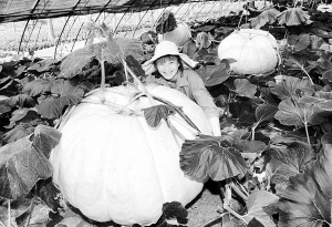 今年年初,在河北秦皇岛市北戴河集发生态农业观光园,技术人员通过将几株南瓜秧苗嫁接后形成多个根系的一根秧苗,集中培育一个南瓜,培育出23个特大南瓜。据介绍,目前这些已成熟的巨型南瓜最小达400斤,最大达500多斤。