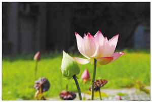 在姐姐的荷花篮里有许多东西——绿的荷叶,红的太阳,还有一群快乐的小青蛙。她把太阳挂在天空中,把荷叶放在水里,把小青蛙放在荷叶上,让它们幸福地长大。