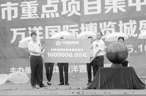 近日,郸城万洋国际博览城置业有限公司为郸城县教育系统捐赠100万元助学金,这是该企业千万助学计划的第一笔资金。十年内该企业将分批捐助总额达1000万元的助学金。将有1000名优秀高中毕业生、2000名贫困学生和1000名优秀教师受到资助。(刘伟 摄)
