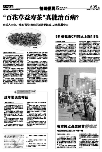 6月21日,记者在沈丘某医院门前的小摊前看到,一个男子的摊位上摆放着数十袋用塑料袋包装的“益寿茶”,摊位下的小音箱不停地播放着功效介绍。摊主介绍,这茶名叫百花草茶,产自云南,主要成分是罗汉果叶,可治疗多种疾病,5元钱一包。
