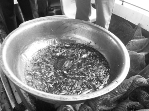 当日15时许,市农业局渔政人员和公安部门干警10余人,乘坐两艘汽艇、一辆汽车,水陆配合展开行动。在沙颍河周口市区八一大道桥东侧不远处,两位渔民划着小船正在从过河台网里打捞捕获的鱼类,被执法人员逮个正着。“先把二人带走接受处罚,把他们的违法工具扣押。”随行的市农业局水产科科长秦应来严厉地说,这种过河台网对鱼类来说,简直就是天罗地网,鱼儿不论大小都逃脱不了。记者看到,在两位渔民捕获的鱼类中,绝大部分是只有几厘米长的幼鱼。