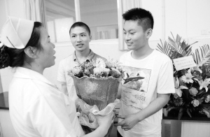 6月23日,医护人员献上鲜花祝贺柳艳兵(中)和易政勇(右)出院。