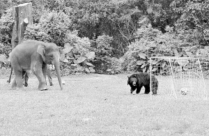 6月22日,广州长隆野生动物世界上演一场“动物世界杯”,大象点球黑熊守门,动物们的表演为游客带来不少笑声。刘卫勇 摄