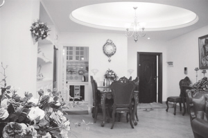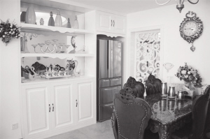 新居在装饰上,体现了有所为有所不为。除了主卧采用墙布装饰、餐厅和电视背景墙采用砖石之外,新居大部分的墙面都采用最普通的白墙。但一楼地砖及二楼地板的用材,花了十几万元,大厅吊灯数万元。全屋红木家具,也是一大亮点。值得一提的是,大厅一些陈列柜采用了现场木作,由于色彩把握得好,与红木家具并没有明显的色差。