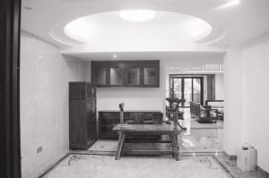 厨房的推拉门,可谓南宁市“独一扇”,融入镜面、花格、玻璃等元素,让人看不出是门。周先生说:“原本店内的样品是没有镜面的,是我硬要人家照着我的想法做。”而餐厅的吊顶,是特别的椭圆形,这也体现了设计师的匠心。椭圆形吊顶要把握好弧度无偏差,着实考验施工的经验。
