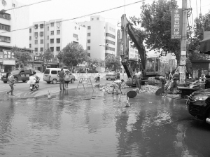 昨日中午12时30分许,在市区八一大道与建新路交叉口路西侧慢车道上,施工人员不慎将地下供水管道挖断,短短几分钟内,该路口就变成一片“泽国”。“银龙”工作人员接到抢修电话后,迅速赶到现场进行抢修。晚报记者 彭慧 摄