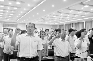 6月30日,太康县直机关工委举行了新党员宣誓和老党员重温入党誓词活动。30多名新老党员面对鲜艳的党旗举起右手庄严宣誓,表达他们为共产主义事业奋斗终生的志愿和决心。晚报记者 张洪涛 通讯员 王宇先 摄