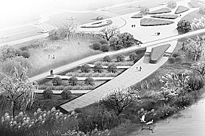 其次,因地制宜传承地域文化:重点展现曲艺文化,通过渔鼓道情景点展现周口非物质文化遗产“太康道情”戏曲艺术,保留周口货运老码头,再现周口河运文化,沙颍安澜一景再现周口风俗文化;以人为本设计宜居场所:无论是从设计上还是从施工工艺上都体现“人”的主题性,如亲水栈道、空中走廊、皮划艇港湾、水榭廊桥的设置安放,道路软硬性铺装的有机结合,实现水陆空立体交通;植物造景发挥生态效益:在整个设计过程中保护沙颍河现有地形、植被,强化驳岸的生态自然化,提高绿化面积;绿色设计弘扬生态文明:铁路桥陆地部分的保留,结合周边绿地形成贯穿东新区的一条绿色廊道,并纳入城市绿网系统,真正实现将城市融于自然。