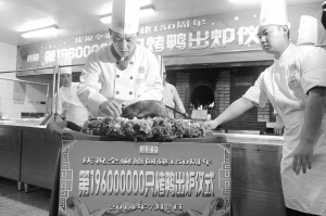 当日,“全聚德”的第1.96亿只烤鸭出炉仪式在“全聚德”前门店举行,同时,“全聚德”在它的起源店——前门店迎来了150周年店庆。新华社记者 张岩 摄