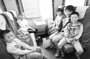 “大娘,带这么多孩子坐火车,不简单啊!”当日10时许,在周口发往上海的K1505次列车的8号硬座车厢,记者见到他们祖孙5人时,刘老太正眯眼小憩,3个外孙和1个外孙女正嘻嘻哈哈地谈笑着。