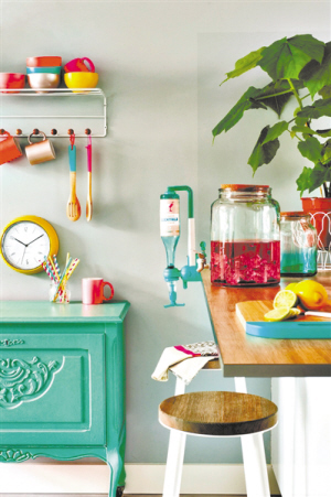 摆在吧台一角的雕花薄荷绿色小边桌清新简洁,菜板手柄和渐变绿的玻璃罐,以及靠墙的绿色植物,给吧台区域增添了十足的绿意,动手调一杯冰爽的鸡尾酒,让清凉升级。